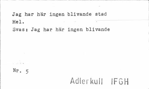 //// Jag har här ingen blivande stad Mel. //// Svas: Jag har här ingen blivande Nr. 5 //// Adlerkull JFGH ////