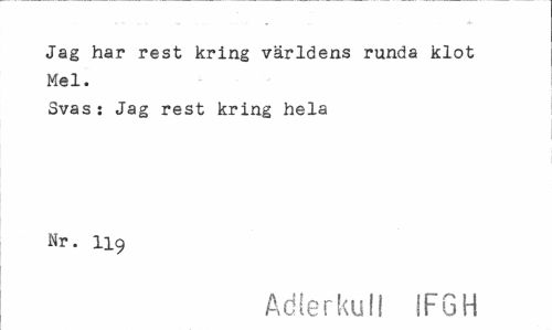 //// Jag har rest kring världens runda klot Mel. //// Svas: Jag rest kring hela Nr. U9 //// Adlerkuli IFGH ////