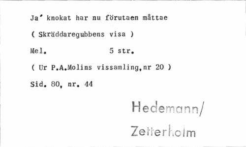 //// Ja' knokat har nu förutaen måttae ( Skräddaregubbens visa ) Mel. 5 str. //// ( Ur P.A.Molins vissamling,nr 20 ) Sid. 80, nr. 44 //// H ederna nn/ Zefterhoim ////
