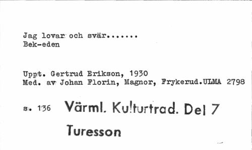 //// Jag lovar och svär... //// Bek-eden //// Uppt. Gertrud Erikson, 1930 //// Med. av Johan Florin, Magnor, Frykerud.ULMA 2798 //// s. 136 VärmL Kulturtrad. Del 7 Turesson ////