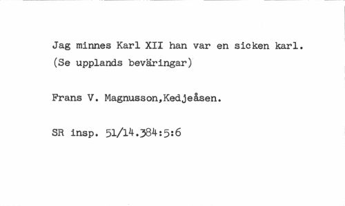 //// Jag minnes Karl XII han var en sicken karl. (Se upplands beväringar) //// Frans V. Magnusson,Kedjeåsen. //// SR insp. 51/14.384:5:6 ////