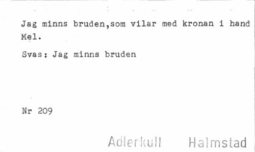 //// Jag minns bruden,som vilar med kronan i hand Mel. //// Svas: Jag minns bruden Nr 209 //// Adlerkuli Halmstad ////