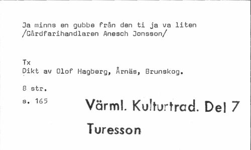 //// 3a minns en gubbe från den ti ja va liten /Gårdfarihandlaren Anesch Jonsson/ //// Tx //// Dikt av Olof Hagberg, Årnäs, Brunskog. 8 str. //// Värml. Kulturtrad. Del 7 Turesson ////