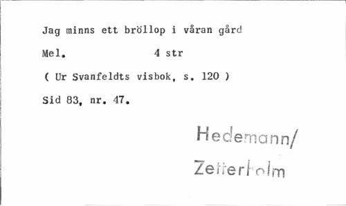 //// Jag minns ett bröllop i våran gård Mel. 4 str //// ( Ur Svanfeldts visbok, s. 120 ) Sid 83, nr. 47. //// Hedern ann/ Zerrerj olm ////