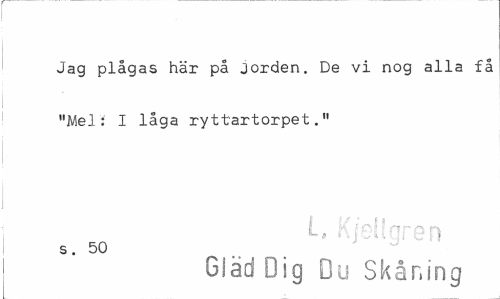 //// Jag plågas här på jorden. De vi nog alla få "Mel: I låga ryttartorpet." //// i» Kjelloren //// s. 50 //// Gläd Dig Dy Skåning ////