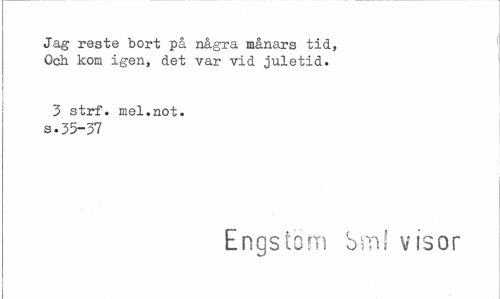 //// Jag reste bort på några månars tid, Och koin igen, det var vid juletid. //// 3 strf. mel.not. s.35-37 //// Engstöm hm! visor ////