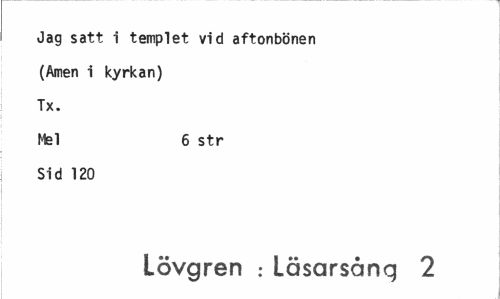 //// Jag satt i templet vid aftonbönen //// (Amen i kyrkan) //// Tx. //// Mel 6 str //// Sid 120 //// Lövgren : Läsarsång 2 ////
