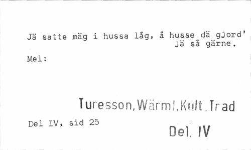 //// Ja satte mäg i hussa låg, å husse dä gjord' //// jä så gärne. //// Mel: //// Turesson, WärmJ. Kult. Trad //// Del IV, sid 25 //// Del. IV ////