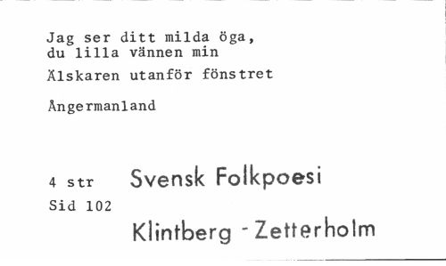 //// Jag ser ditt milda öga, du lilla vännen min //// Älskaren utanför fönstret Ångermanland //// 4 str Svensk Folkpoesi //// Sid 102 //// Klintberg - Zetterholm ////