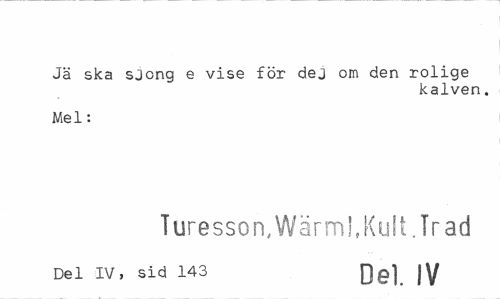 //// Jä ska sjöng e vise för dej om den rolige //// kalven. //// Mel: //// Turesson, Wärml, Kult. Tr ad //// Del IV, sid 143 |y ////