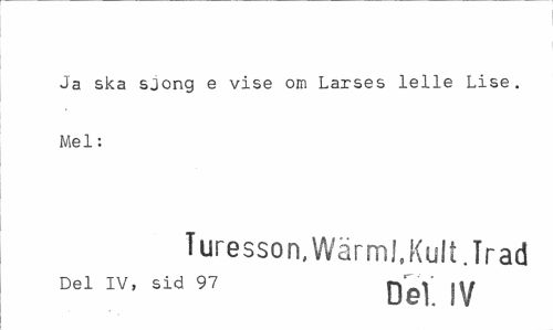 //// Ja ska sjöng e vise om Larses lelle Lise. Mel: //// Turesson, Wärml, Kult. Trad //// Del IV, sid 97 jy ////
