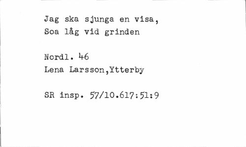 //// Jag ska sjunga en visa, Soa låg vid grinden //// Nordl. 1+6 //// Lena Larsson,Ytterby SR insp. 57/10.617:51:9 ////