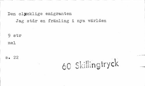 //// Den olycklige emigranten //// Jag står en främling i nya världen //// 9 str mel //// s. 22 //// 6C SkillingtrycK ////