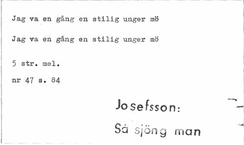 //// Jag va en gång en stilig unger mö //// ¦ //// Jag va en gång en stilig unger mö //// 5 str. mel. nr 47 s. 84 //// Josefsson: //// Sä sjöng man ////