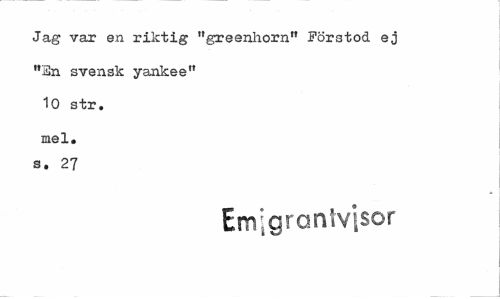 //// Jag var en riktig "greenhorn" Förstod ej //// "En svensk yankee" //// 10 str. //// mel. s. 27 //// Emigranivisor ////