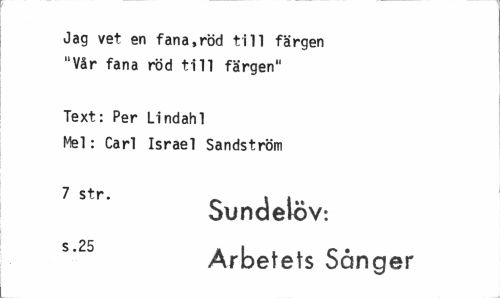 //// Jag vet en fana,röd till färgen "Vår fana röd till färgen" //// Text: Per Lindahl //// Mel: Carl Israel Sandström //// 7 str. , //// Sundelov: s'25 Arbetets Sånger ////
