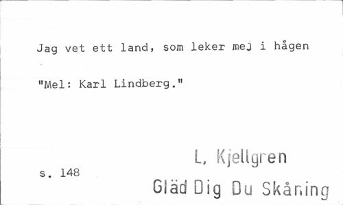 //// Jag vet ett land, som leker mej i hågen "Mel: Karl Lindberg." //// L, Kjellgren //// s. 148 //// Gläd Dig Du Skåning ////