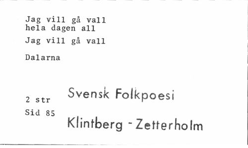 //// Jag vill gå vall hela dagen all //// Jag vill gå vall Dalarna //// Svensk Folkpoesi //// 2 str ~ //// Sid 85 I- I //// Klintberg "Zetterholm ////