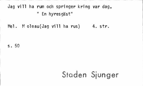 //// Jag vill ha rum och springer kring var dag, " En hyresgäst" //// Hel. M oleau(Jag vill ha rus) 4. str. s. 50 //// Staden Sjunger ////