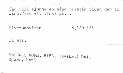 //// Jag vill sjunga en sång, fastän tiden den är lång,/vid att tänka pä... //// Elverumsvisan s.130-131 //// 11 str. //// MALUNGS KOMM. BIBL. (avskr.) Dal. Sporr, Karl ////