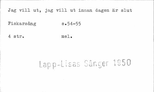 //// Jag vill ut, jag vill ut innan dagen är slut Fiskarsång s.54-55 //// 4 str. mel. //// Lapp-Lisas Gånrer 1850 ////