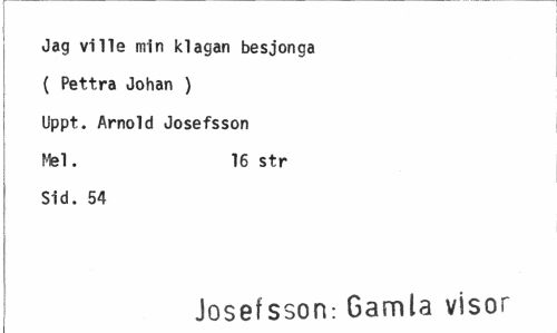 //// Jag ville min klagan besjonga //// ( Pettra Johan ) i * //// Uppt. Arnold Josefsson Mel. 16 str //// Sid. 54 //// Josefsson: Gamla visor ////