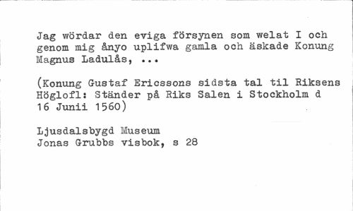 //// Jag wördar den eviga försynen som welat I och genom mig ånyo uplifwa gamla och äskade Konung Magnus ladulås, ... //// (Konung Gustaf Ericssons sidsta tal til Riksens Höglofl: Ständer på Siks Salen i Stockholm d 16 Junii 1560) //// Ljusdalsbygd Museum Jonas Grubbs visbok, s 28 ////