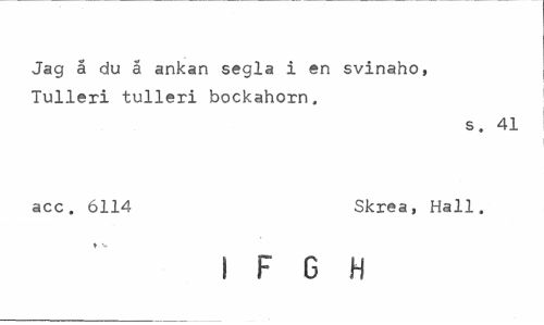 //// Jag a du a ankan segla i en svinaho, Tulleri tulleri bockahorn, //// s, 41 //// acc. 6114 Skrea, Hall, //// I F G H ////