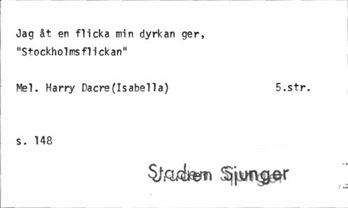 //// Jag åt en flicka min dyrkan ger, "Stockholmsflickan" //// Mel. Harry Dacre(Isabella) 5.str. //// s. 148 ////