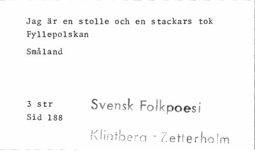 //// Jag är en stolle och en stackars tok Fyllepolskan //// Småland //// 3 str Svensk ^olicpoes! //// Sid 188 //// KI i n th era - letter h o •! m ////