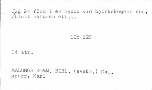 //// Jag är född i en hydda vid björkskogens sus, /bl ott naturen ett. . . //// 126-128 //// 14 str. //// MALUNGS KOMM. BIBL. (avskr.) Dal. Sporr, Karl ////