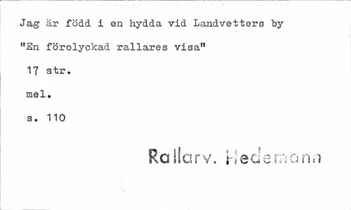 //// Jag är född i en hydda vid Landvetters by "En förolyckad rallares visa" 17 str. mel. s. 110 //// Ro liar v. Heclemann ////