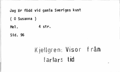 //// Jag är född vid gamla Sveriges kust //// ( O Susanna ) //// Mel. 4 str. //// Sid. 96 //// Kjellgren: Visor från farfars tid ////
