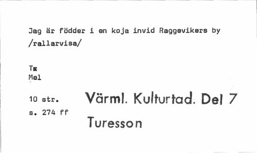 //// Dag är födder i en koja invid Raggevikers by /rallarvisa/ //// Tk Mel //// 10 str. Värml. Kufturtad. Del 7 //// s. 274 ff //// Turesson ////