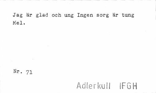//// Jag är glad och ung Ingen sorg är tung Kel. //// Nr. 71 //// Adlerkuli IFGH ////