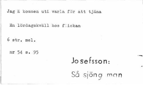//// Jag ä kommen uti varla for att tjäna //// Bn lördagskväll hos flickan //// 6 str. mel. nr 54 s. 95 //// Josefsson: //// Sa sjön a mnn ////