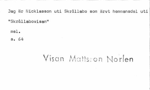 //// 3ag är Micklasson uti Skrållabo som ärvt hemmansdel uti //// "Skrållabovisan" //// mel. s. 64 //// Visan M a 11 s: o n. No rf en ////