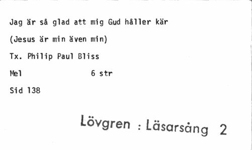 //// Jag är så glad att mig Gud håller kär //// (Jesus är min även min) //// Tx. Philip Paul Bliss //// Mel 6 str //// Sid 138 //// Lövgren . Läsarsång 2 ////