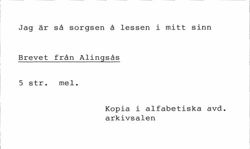 //// Jag är så sorgsen å lessen i mitt sinn //// Brevet från Alingsås 5 str. mel. //// Kopia i alfabetiska avd. arkivsalen ////