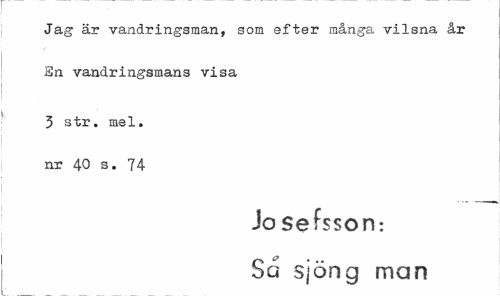 //// Jag är vandringsman, som efter många vilsna år Sn vandringsmans visa //// 3 str. mel. nr 40 s. 74 //// Jo sefsson: Sa sjöng man ////