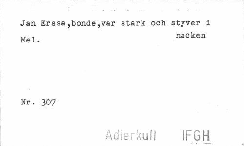 //// Jan Erssa,bonde,var stark och styver i //// .. , nacken //// Hel. //// Nr. 307 //// Adierkufl IFGH ////