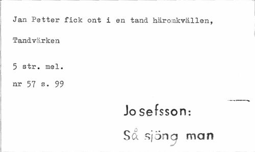 //// Jan Petter fick ont i en tand häromkvällen, Tandvärken //// 5 str. mel. nr 57 s. 99 //// Josefsson-. //// Sa siöng man ////