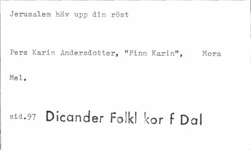 //// Jerusalem hav upp din röst //// Pers Karin Andersdotter, "Finn Karin", Mora Mel. //// sid. 97 Dicander Foikf kor f D<ai ////