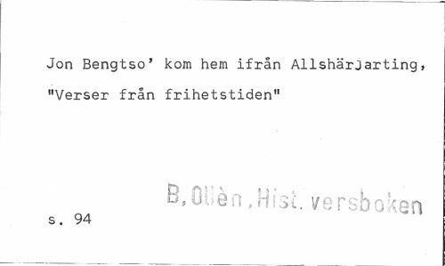 //// Jon Bengtso' kom hem ifrån AllshärJarting, "Verser från frihetstiden" //// én ,Hist. versboken //// s. 94 ////