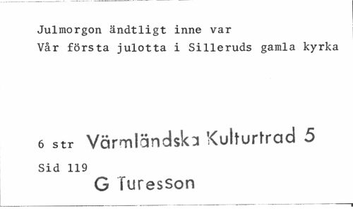 //// Julmorgon ändtligt inne var //// Vår första julotta i Silleruds gamla kyrka //// 6 str Värmländska Kulturtrad 5 //// Sid 119 //// G Turesson ////
