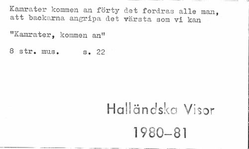 //// Kamrater kommen an förty det fordras alle man, att backarna angripa det värsta som vi kan //// "Kamrater, kommen an" //// 8 str. mus. s. 22 //// Halländska Visor //// 1980-81 ////