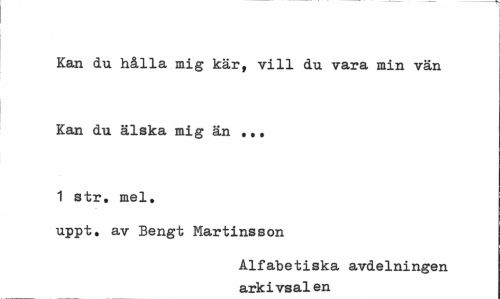 //// Kan du hålla mig kär, vill du vara min vän Kan du älska mig än ... 1 str. mel. //// uppt. av Bengt Martinsson //// Alfabetiska avdelningen arkivsalen ////