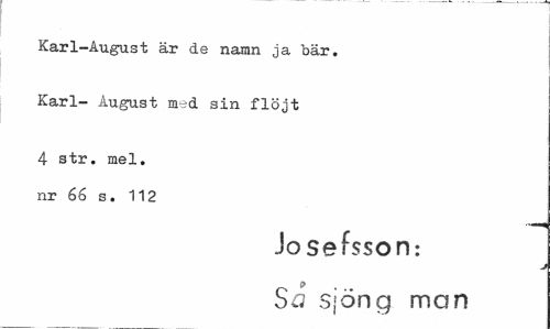 //// Karl-August är de namn ja bär. //// Karl- August med sin flöjt //// 4 str. mel. nr 66 s. 112 //// Jo sefsson: //// SvJ sjöng man ////