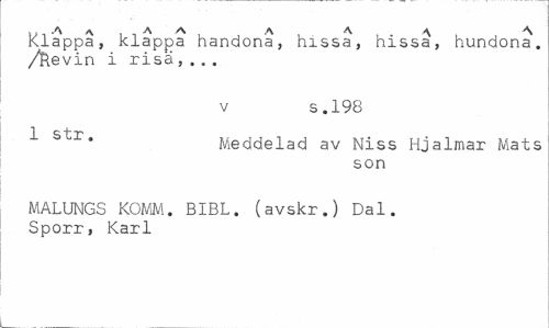 //// Klappa, klappa handonå, hissa, hissa, hundona. /Revin i risä, . . . //// v s.198 //// 1 str //// Meddelad av Niss Hjalmar Mats son //// MALUNGS KOMM. BIBL. (avskr.) Dal. Sporr, Karl ////