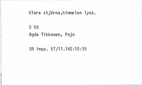 //// Klara stjärna,himmelen lysa. D 58 //// Agda Tikkanen, Pojo SR insp. 57/11.142:10:15 ////